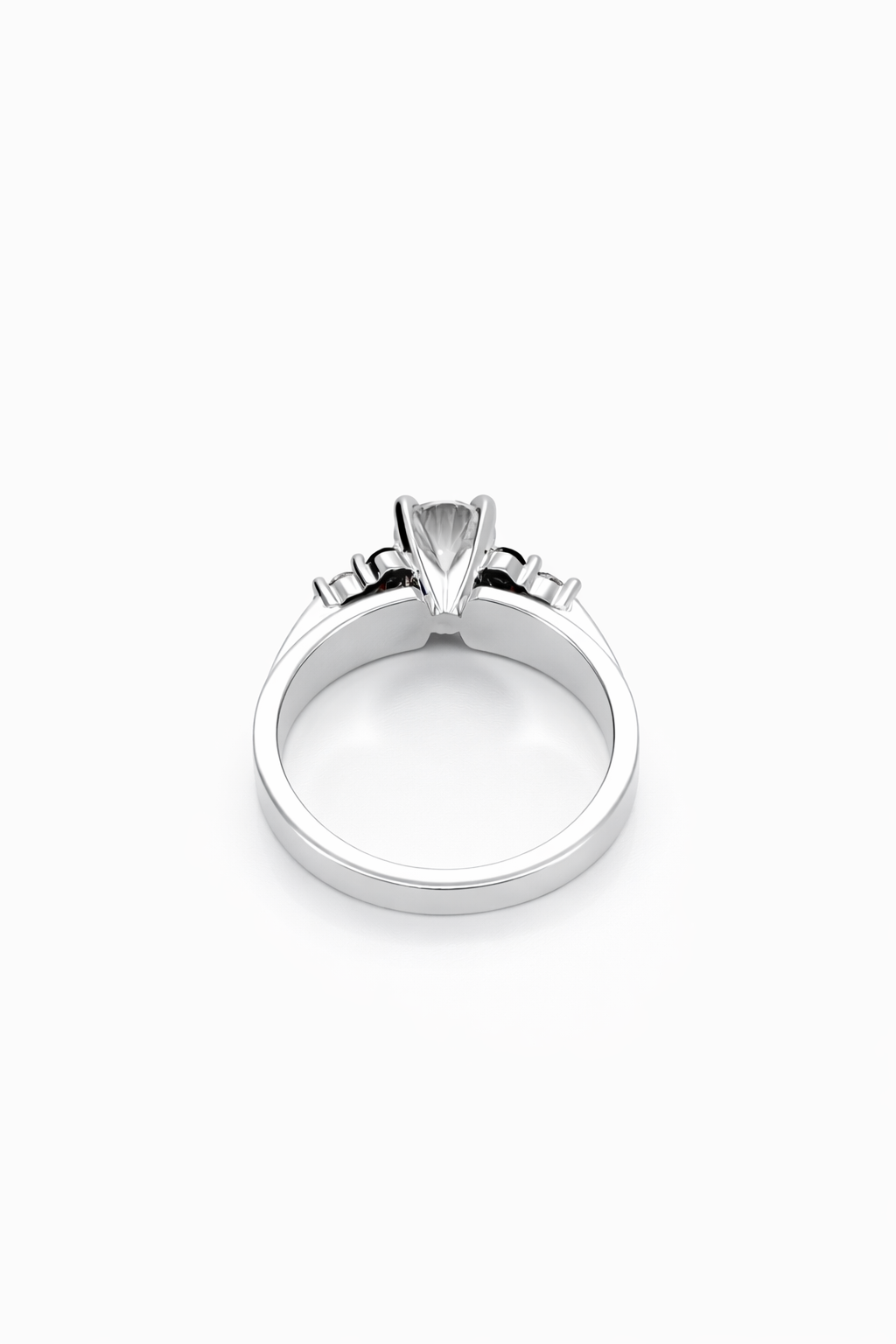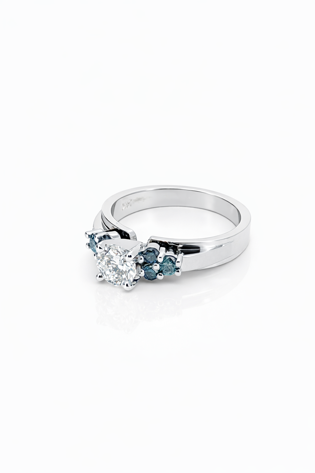 Flanking the centre stone are natural blue diamond accents totaling 0.30 carats, adding a distinctive touch of colour and contrast while maintaining a refined, timeless look. The sleek band and balanced setting highlight the diamonds without overpowering them, making this ring perfect for someone who appreciates subtle uniqueness.